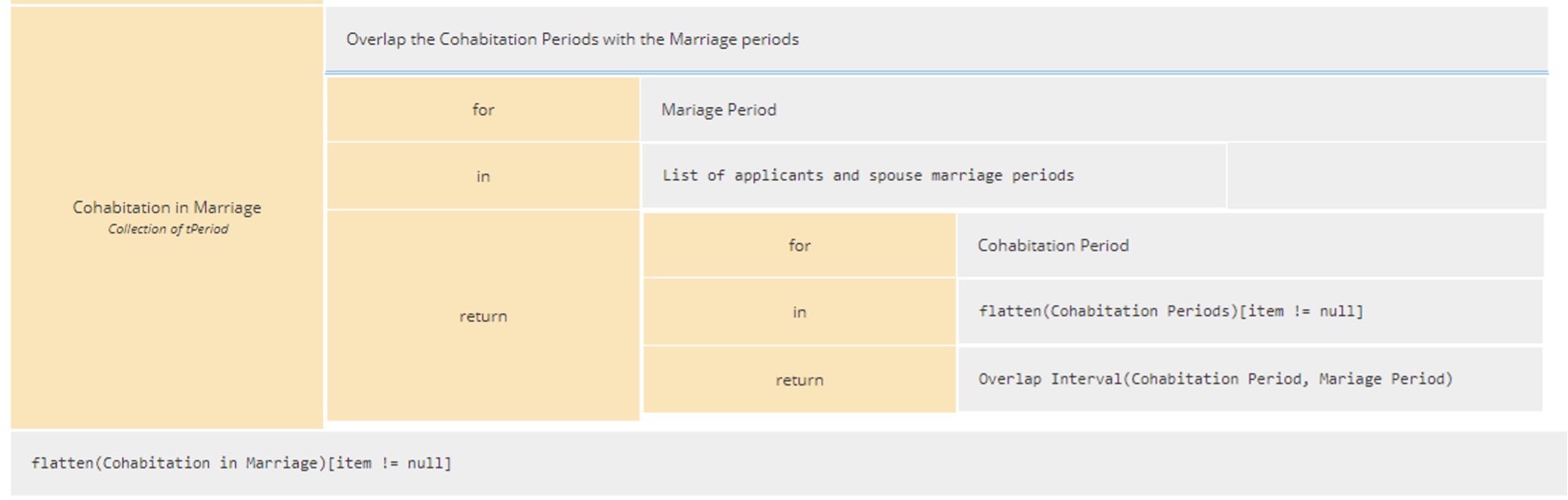 We can now complete our Boxed Expression for the Periods Overlaps decision. Armed with the Collection of Cohabitation Periods, we can now look for overlaps with the Marriage periods and return a single Collection of Periods Overlap by flattening the Cohabitation in Marriage Collection while taken care of removing the null entries that our BKM may have introduce when there was no overlap.