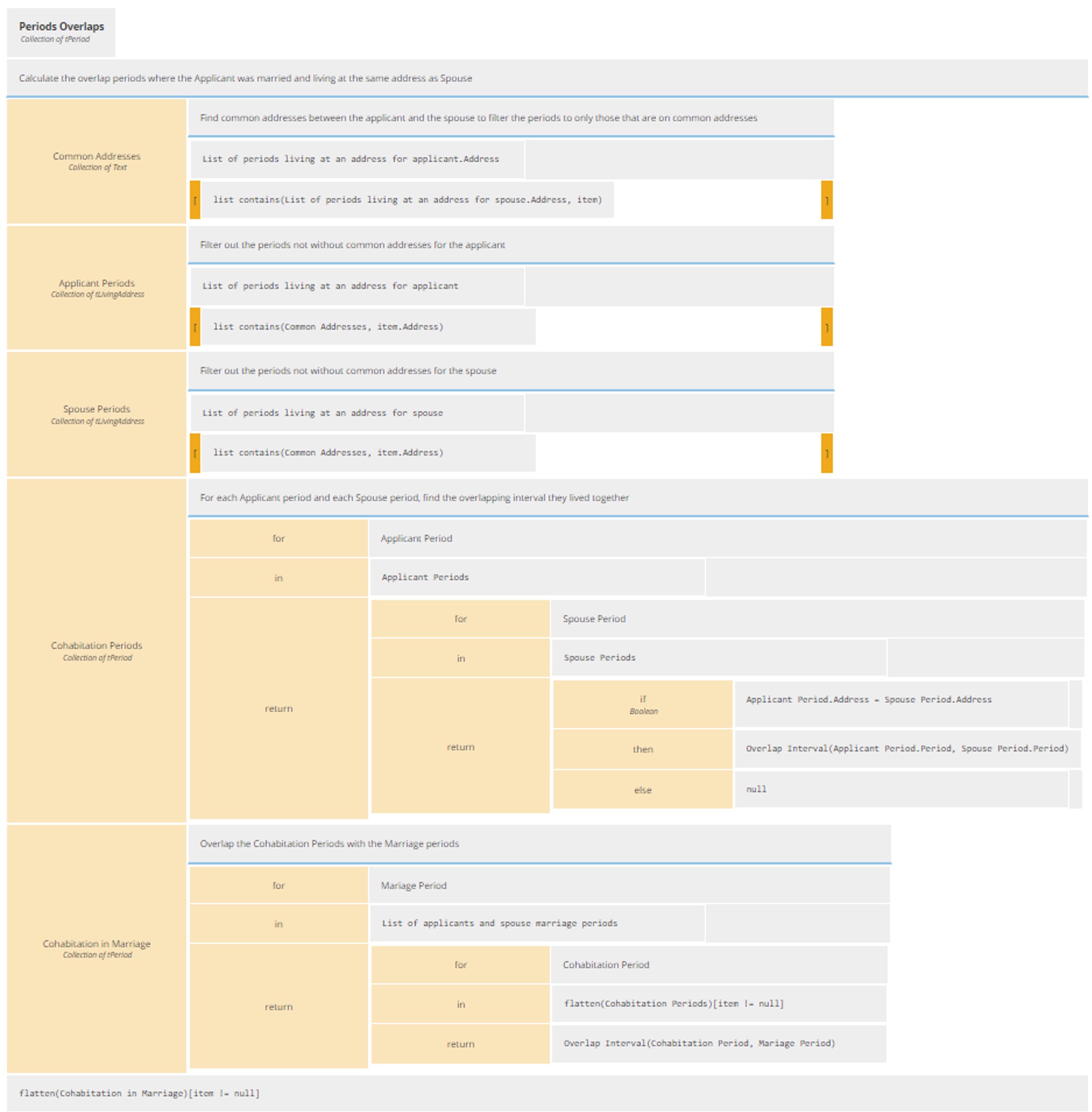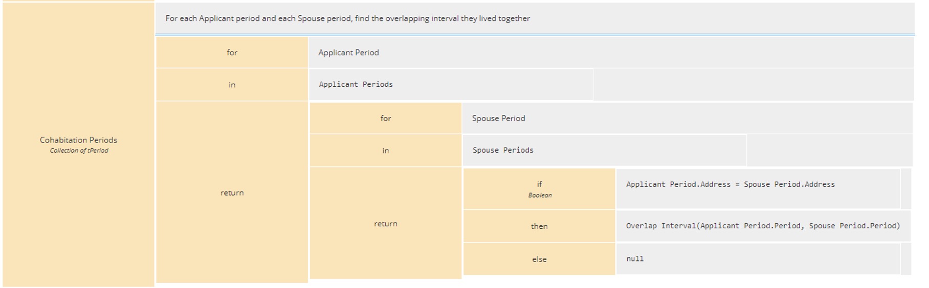 We can now identify the Cohabitation Periods. To achieve this, we will iterate over the Applicant Periods and the Spouse Periods at a common address identified just before and only extract the subperiods the that overlaps. There is no prebuilt FEEL function that extracts overlapping subperiods, we therefore need to create ourselves a Business Knowledge Model (BKM) that will look at two periods and return either an overlap subperiod or null. Here is the logic of that BKM.