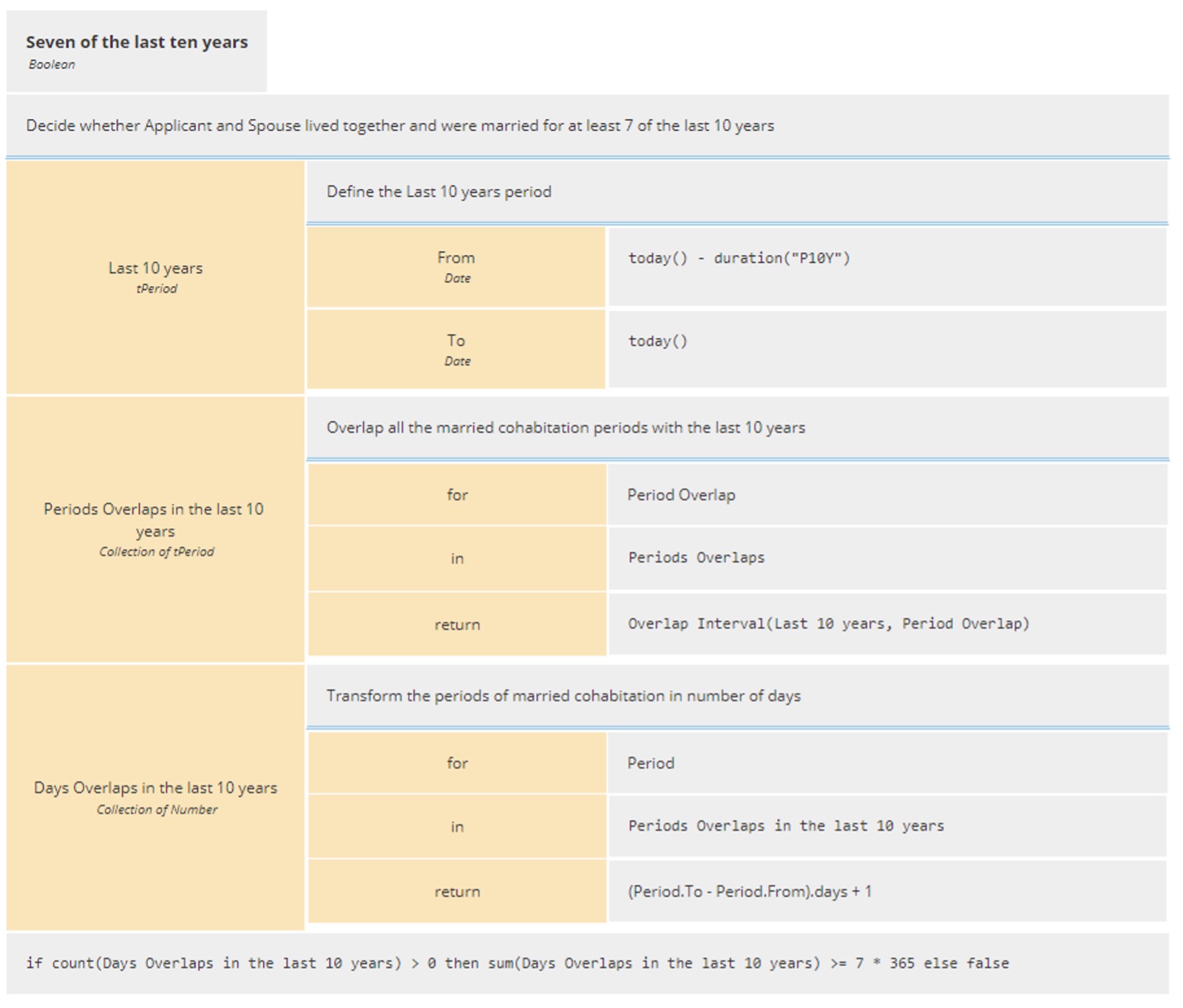 Having obtained a Collection of Periods Overlaps for the applicant and Spouse we can now decide if these overlaps add up to Seven of the last ten years. This Decision simply returns TRUE if the applicant and spouse were living together and married for at least seven of the last ten years. We will not go into all the details this time as by now you can easily read the boxed context and annotations to guide yourself. We will only bring your attention to the invocation of our BKM Overlap Interval created before in the return portion of the Periods Overlaps in the last 10 years below.