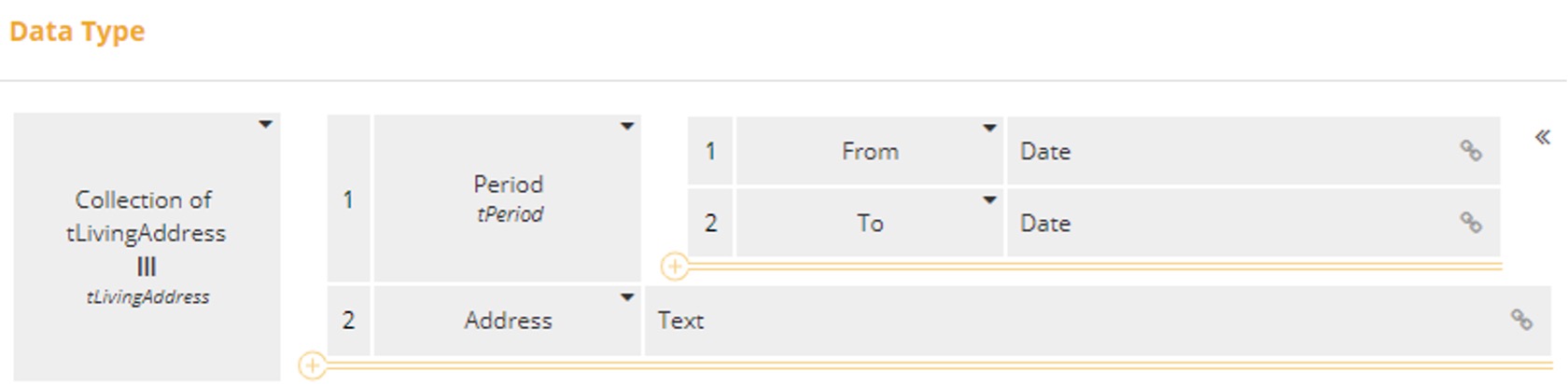 As for both the List of periods living at an address for applicant (From, To, Address) and the List of periods living at an address for spouse (From, To, Address), they are defined as a Collection of tLivingAdress that reuses our tPeriod type definition above.