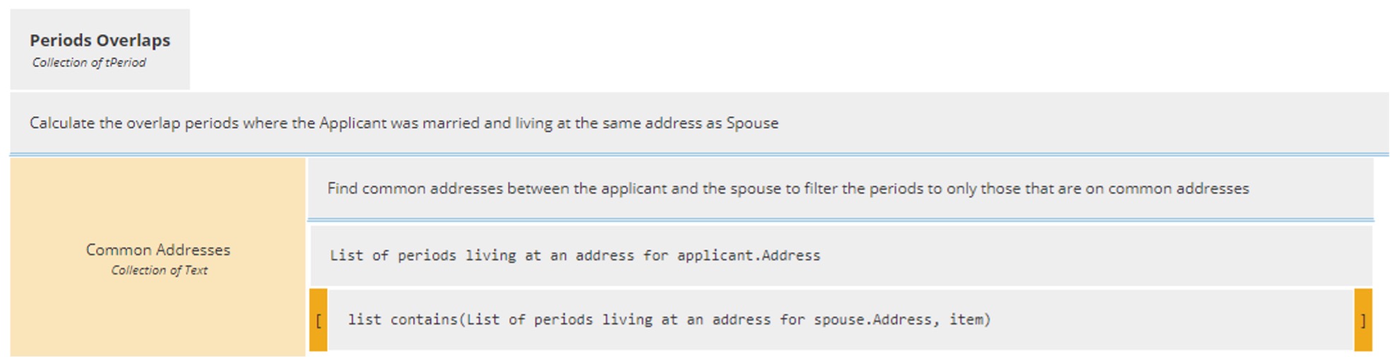 To obtain the Periods Overlaps Decision which calculates the overlap periods where the Applicant was married and living at the same address as Spouse, we will progressively build a Boxed Context. This is done here to help more novice readers. Advanced users may skip to the completed Boxed Context at the end of this section.
