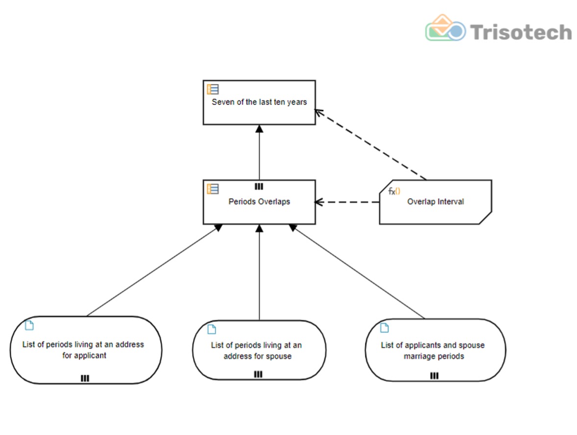 In the DRD above, the three provided lists are used as Data Inputs to a Decision that produced a collection of Periods Overlaps which are then submitted to a Decision of whether these Periods Overlaps add up to Seven of the last ten years.